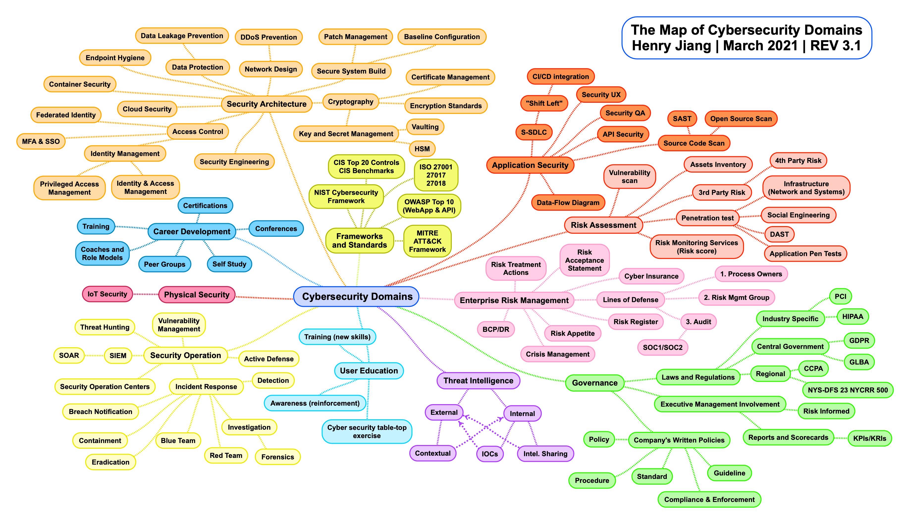 Henry Jiang v3.1Explora los 11 dominios de ciberseguridad con más de 150 subdominios. Mapa interactivo con zoom, filtros y descripciones detalladas de cada área. Pasa el mouse sobre cualquier nodo para ver qué es con ejemplos reales.